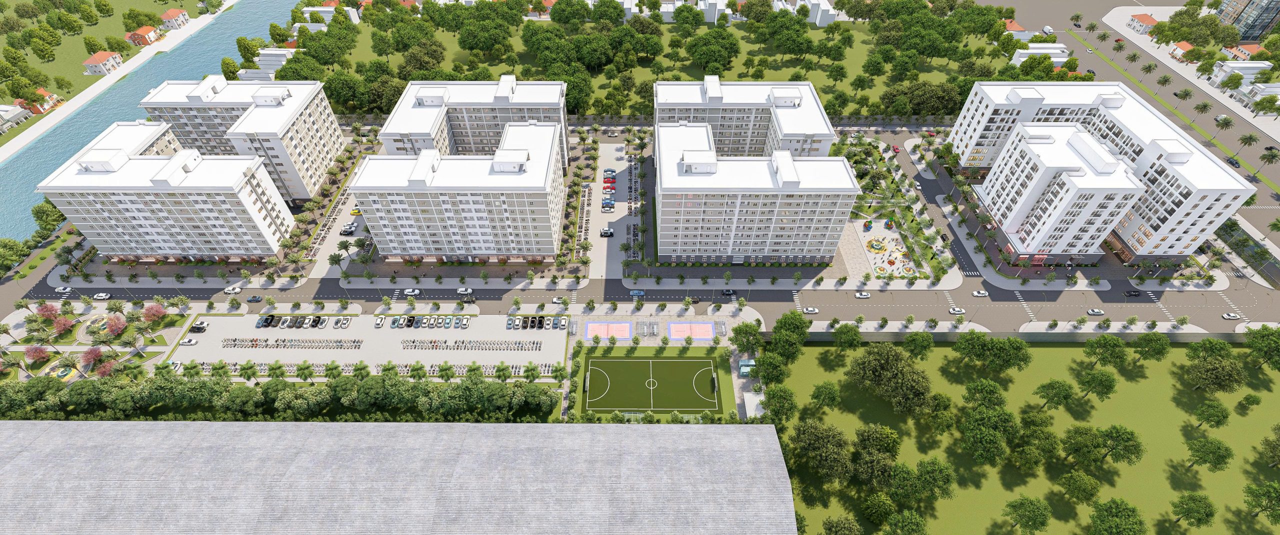 Giữa các tòa là hệ thống cây xanh, sân thể thao, khu vui chơi, đường nội khu và bãi đỗ xe rộng rãi.
